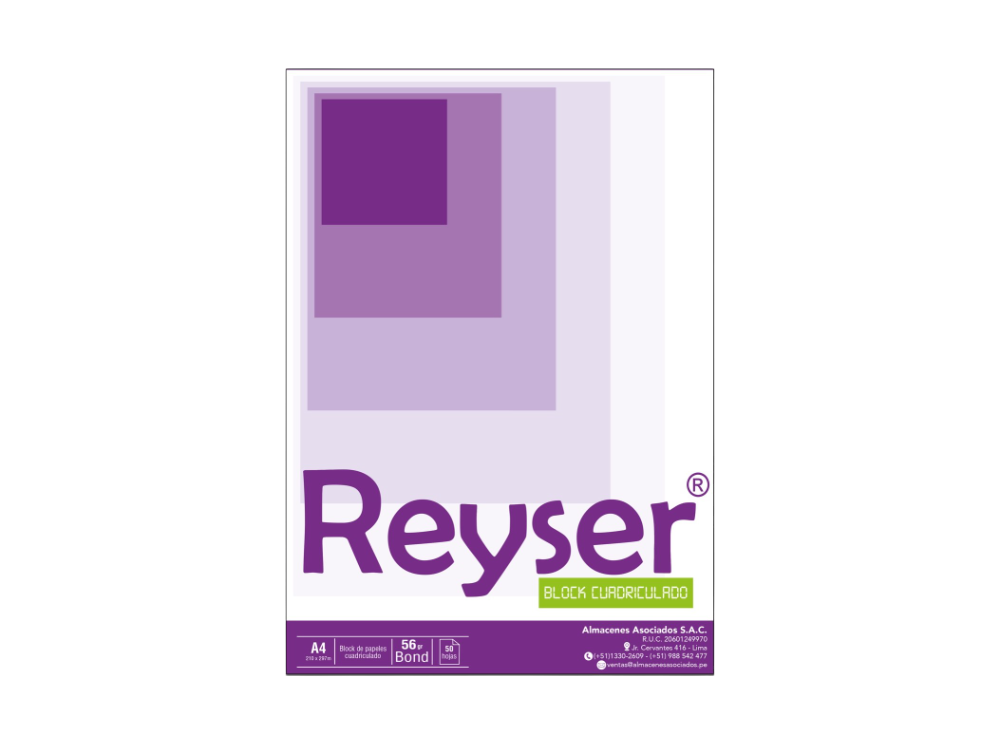 BLOCK : T/CUADRICULADO D/PAPEL BOND TAM: A4 CONT: 50 HOJAS G: 56 gr COL: BLANCO G.F: 12 MESES UNIDAD REYSER R100656