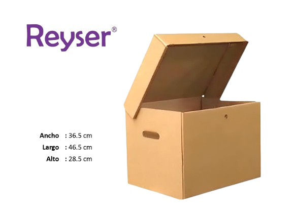 CAJA ARCHIVADORA CON TAPA : MATERIAL: CARTON CORRUGADO DISENO: AUTOARMABLE C/TAPA INTEGRADA CON AGARRADERAS MEDIDAS EXTERNAS: LARGO_EXT (L): 46.5 cm ANCHO_EXT (A): 36.5 cm ALTO_EXT (H): 28.5 cm MEDIDAS INTERNAS: LARGO_INT (L): 44.7 cm ANCHO_INT (A): 34.9 cm ALTO_INT (H): 27.5 cm COLOR: MARRON GRAMAJE: 644 g/m2 CAP. APILAMIENTO: 125 kg CAP. CARGA: 25 kg NO TIENE AGUJEROS DE VENTILACION AGUJEROS P/PRECINTO DE SEGURIDAD: SI G.F: 12 MESES ON SITE UNIDAD DE DESPACHO: UNIDAD REYSER R100849