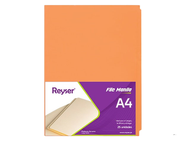 FOLDER : T/MANILA D/CARTON TAM: A4 CAP. MAX: 20 HOJAS COL: ANARANJADO G.F: 18 MESES PAQUETE X 25 UNIDADES REYSER COLOR R100179