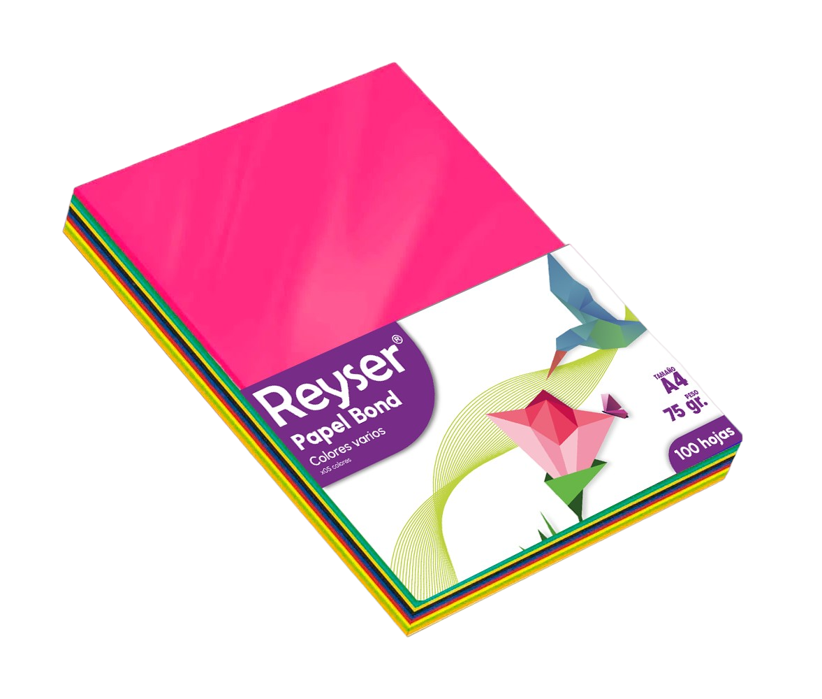 PAPEL BOND : T/FOTOCOPIA-ALISADO TAM: A4 G: 75 gr COL: COLORES VARIOS G.F: 12 MESES PAQUETE X 100 HOJAS REYSER PAQUETE X 5 COLORES R100778