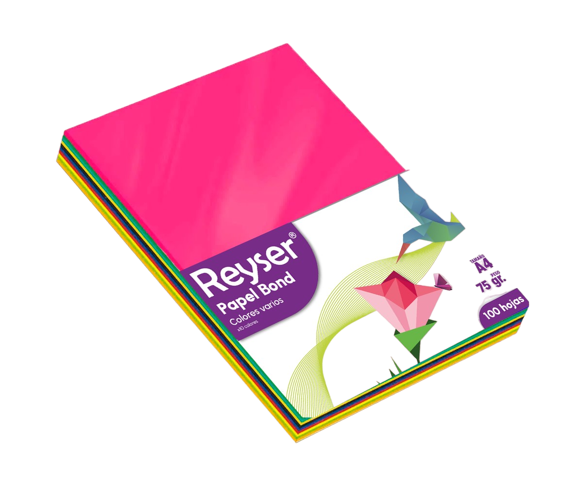 PAPEL BOND : T/FOTOCOPIA-ALISADO TAM: A4 G: 75 gr COL: COLORES VARIOS G.F: 12 MESES PAQUETE X 100 HOJAS REYSER PAQUETE X 10 COLORES R100779